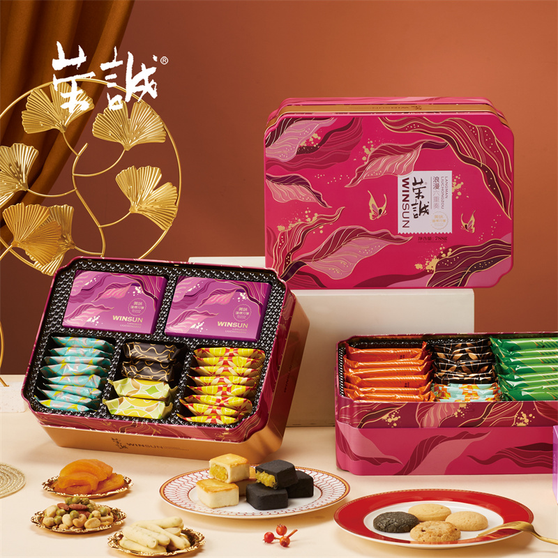 100g綜合果仁x1,70g黃桃干x1,8g原味奶油曲奇x8,10g椰蓉奶酥x8,30g香妃鳳梨酥x2,30g黑金鳳梨酥x2,10g香焙黑芝麻酥x8,10g香焙蔓越莓酥x7,13.5g澳式金泊雞蛋卷(芝麻原味)x8,12g蔥香卡拉棒x8