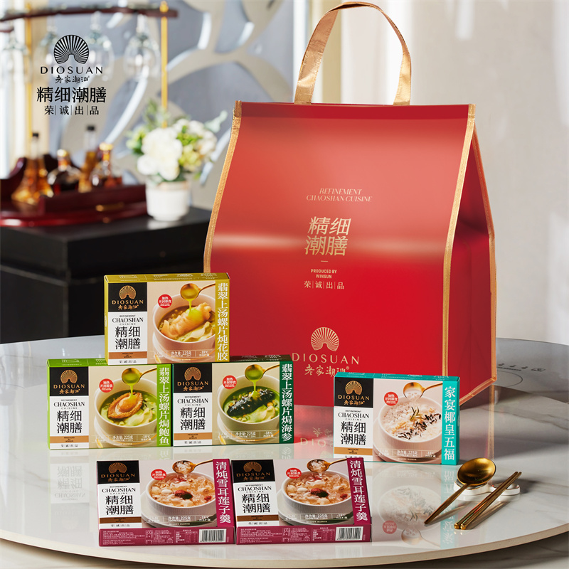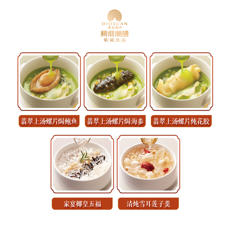 225g翡翠上湯螺片焗鮑魚x1,225g翡翠上湯螺片焗海參x1,225g翡翠上湯螺片燉花膠x1,225g家宴椰皇五福x1,225g清燉雪耳蓮子羹x2