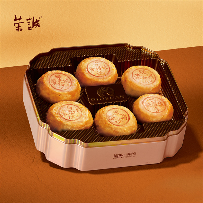 100g潮式綠豆沙月餅x1,100g潮式烏豆沙月餅x1,100g潮式雙烹月餅x1,100g潮式鴨屎香茶月餅x1,80g潮式綠豆沙蛋黃雪媚娘月餅x1,80g潮式烏豆沙蛋黃流沙月餅x1